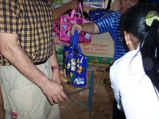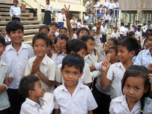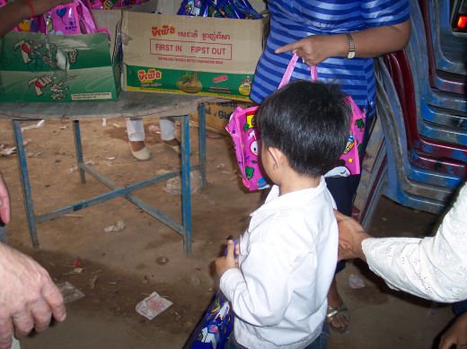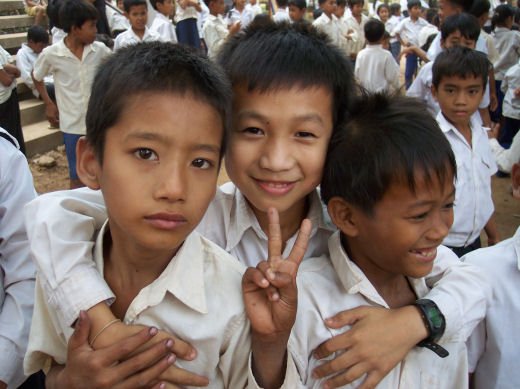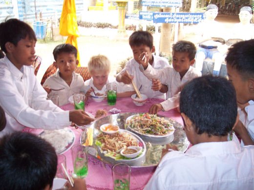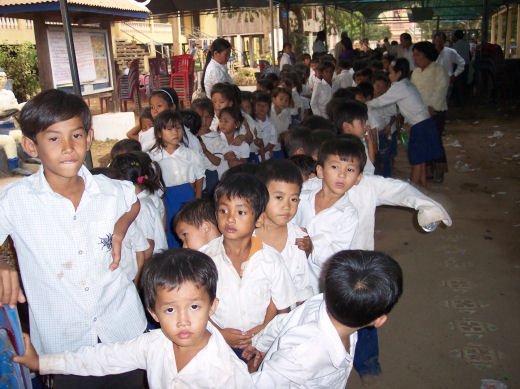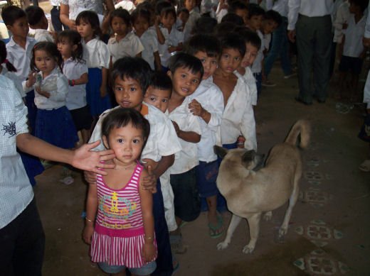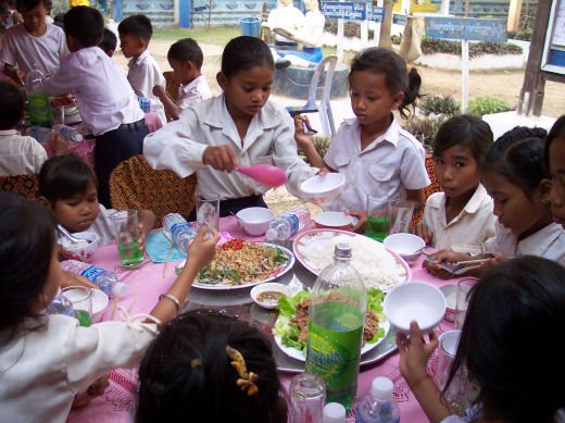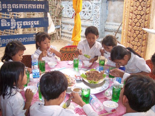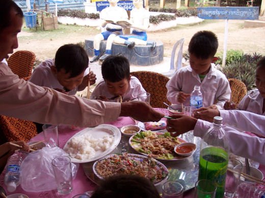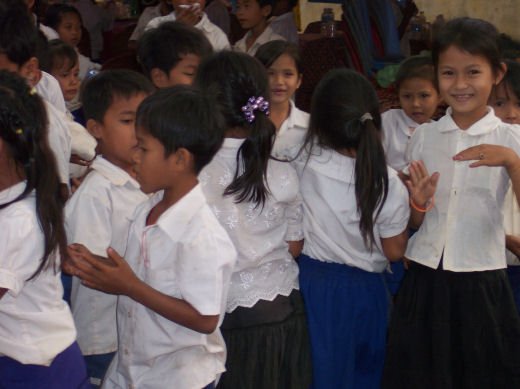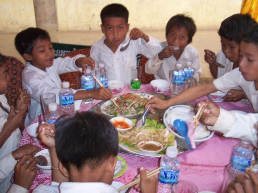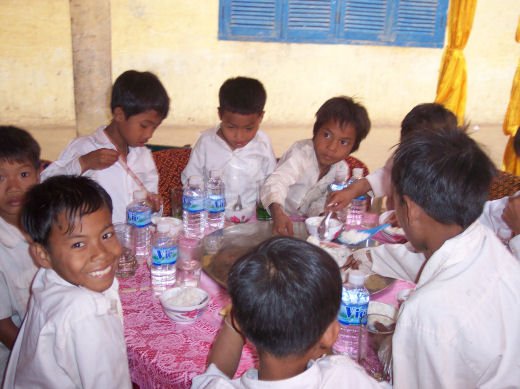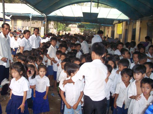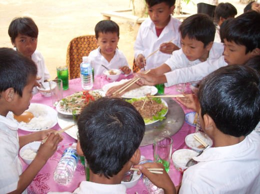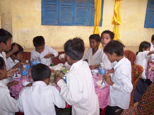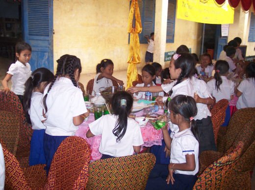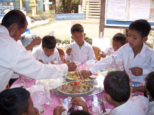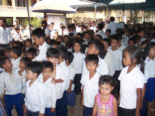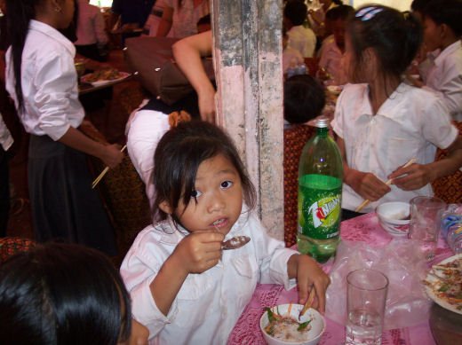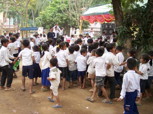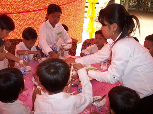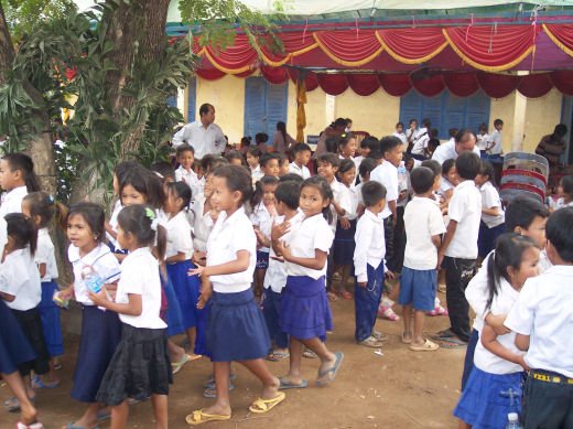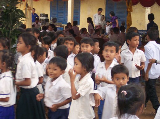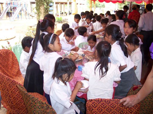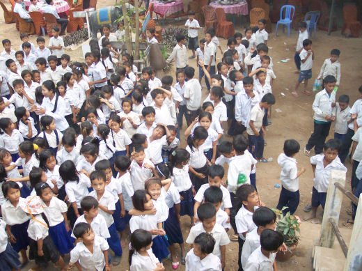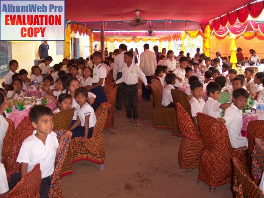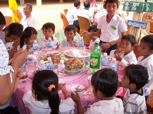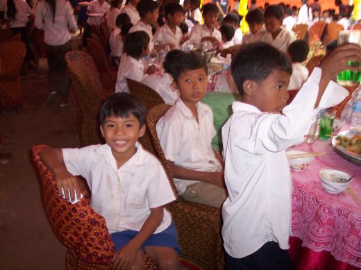 Comme depuis 5 ans maintenant, les enfants ne tarissent pas de joie, c’est pour eux, l’occasion de pouvoir pour la seule fois de l’année où ils peuvent vivre une journée d’enfant à rire et jouer, se retrouver autour d’une table et faire un vrai repas. Cette année, autour de 40 tables étaient réunis : 365 élèves dont 156 filles et 209 garçons, 10 professeurs, 10 parents d'élèves, 10 autorités locales et 2 membres de l’association AME D’ASIE Soit en tout 397 personnes, Par table, on trouvait comme prévu, 1 sauté de bœuf, 1 salade vermicelle, 1 soupe acide échine de porc, 1 sauté de porc aux légumes variés, du riz à volonté, 1 bouteille de 2100_7977litres de boisson sucrée, 10 bouteilles de 50 cl d'eau minérale et 10 barquettes de dessert (multiples Gâteaux Khmers) Le repas a été suivi par une grande fête où tout le monde a pu montrer ses talents de danseur tout aussi bien sur de la musique disco que sur de la musique beaucoup plus soft de danses traditionnelles Khmères. La journée s’est terminée vers 19 heures par la distribution de riz pour les enfants en grande détresse et d’affaires scolaires et jouets pour tout le monde. 100_7979Toutefois, il y a une petite ombre à ce tableau, telle une trainée de poudre de villages en villages, la fête de l’école fait grand bruit et de mémoire de Cambodgien, aucune école de la région n’a jamais connue de telle réjouissances. Cet engouement pourrait nous réjouir et nous rendre fiers si cela ne créait pas de l’envie chez les enfants des villages voisins et certains parents viennent de très loin pour inscrire leurs enfants à cette école. Avec seulement 10 classes, notre petite école sera vite saturée sachant qu’il y a déjà 465 élèves.