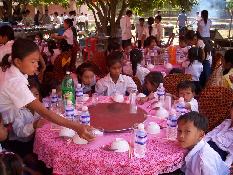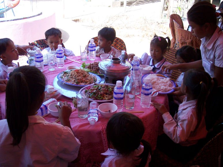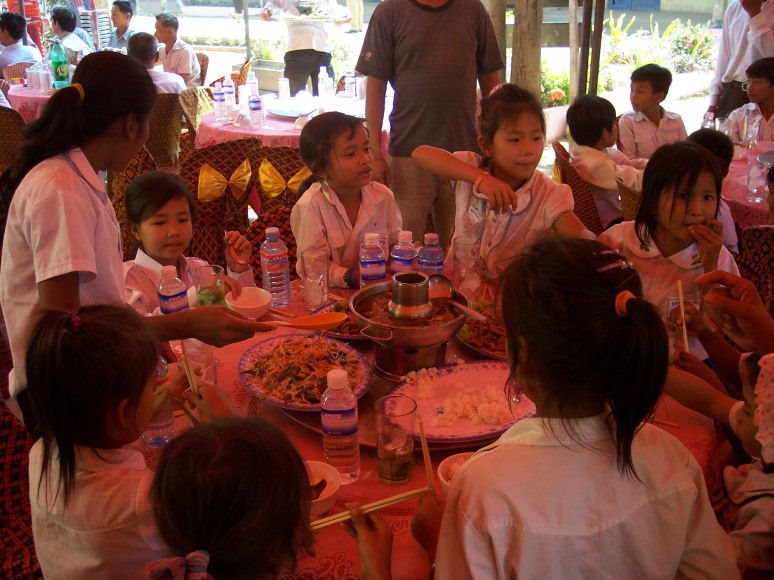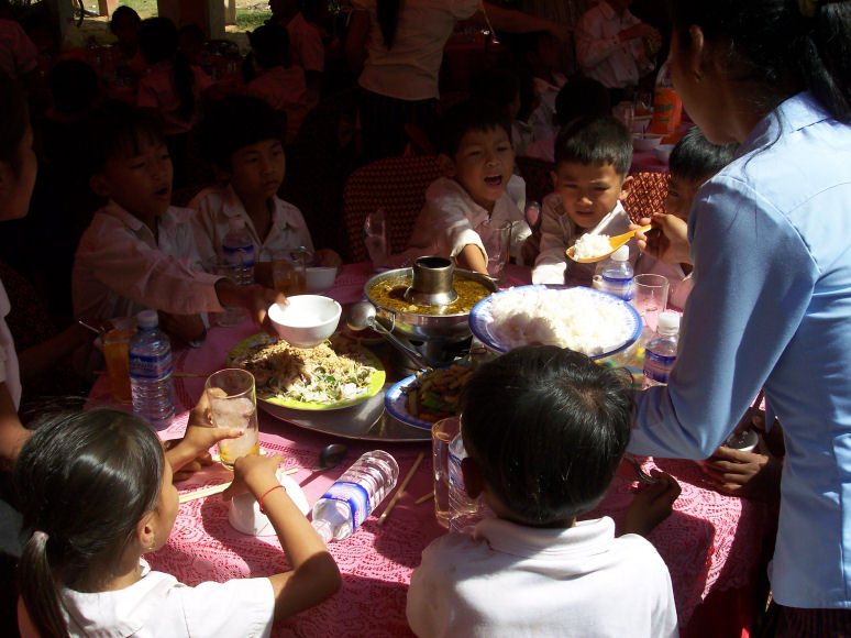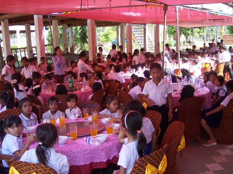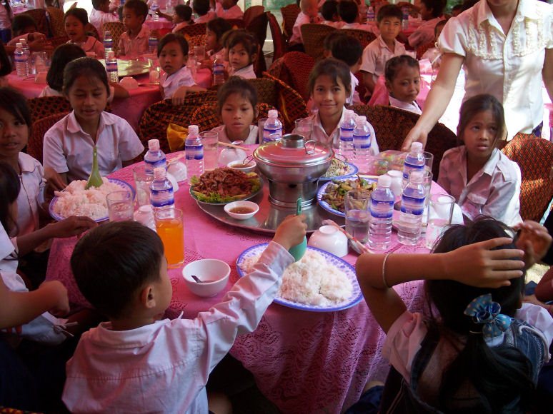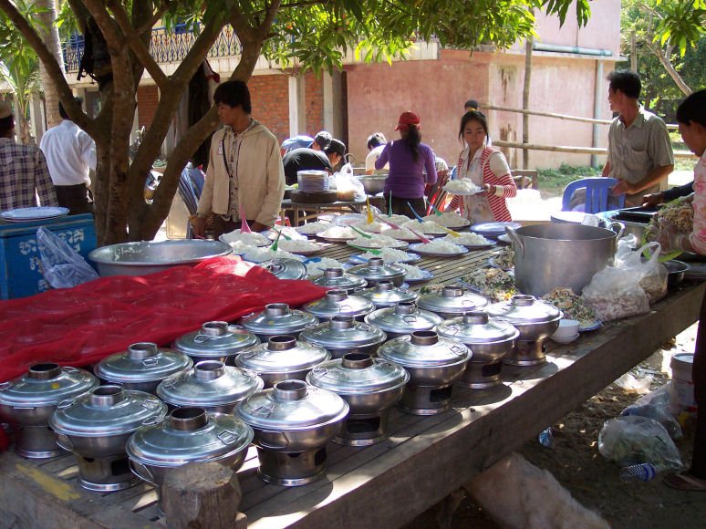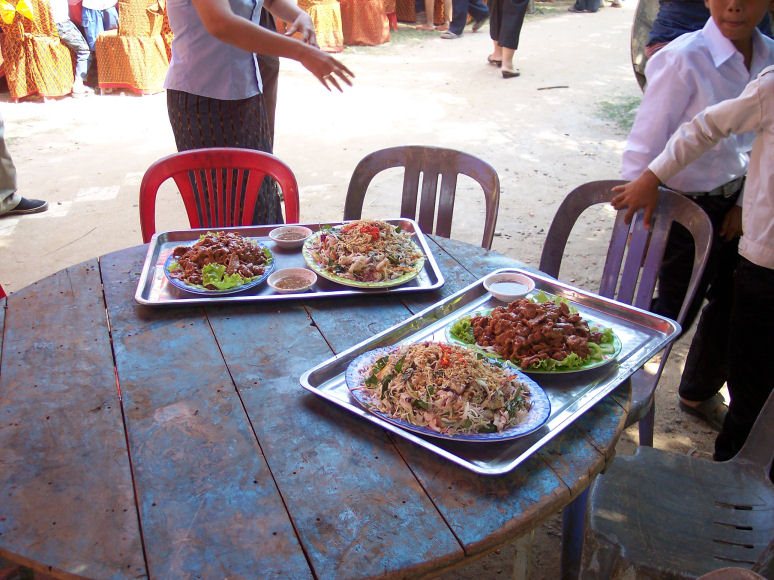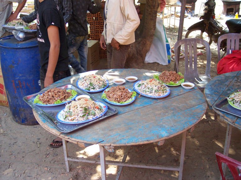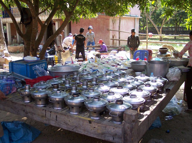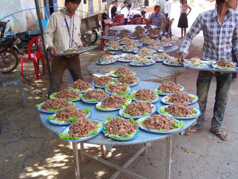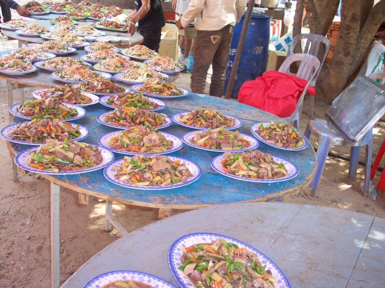 Repas1 sauté de bœuf, 1 salade vermicelles, 1 soupe acide échine de porc, 1 sauté de porc aux légumes variés, du riz à volonté, 1 bouteille de 2 litres de soda, 10 bouteilles de 50 cl d'eau minérale et 10 barquettes de dessert (multiples Gâteaux Khmers)