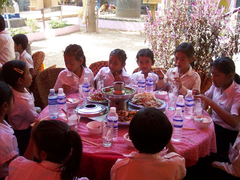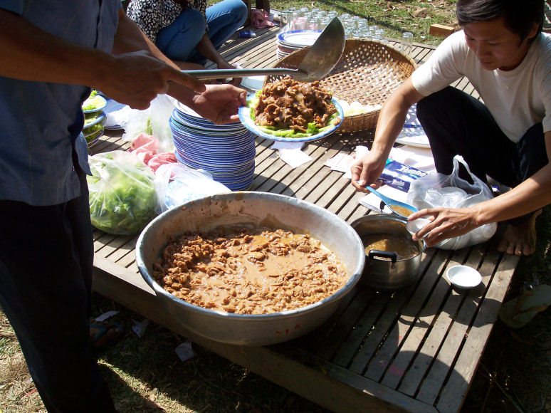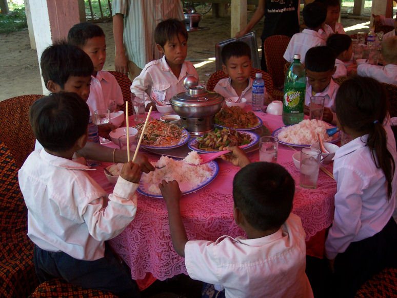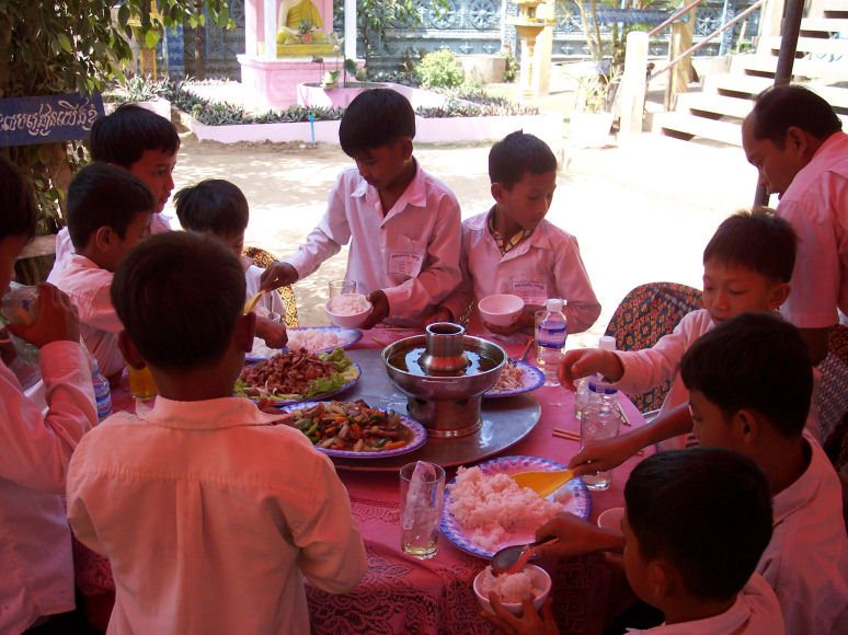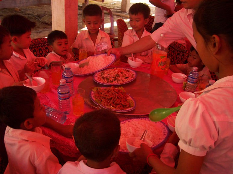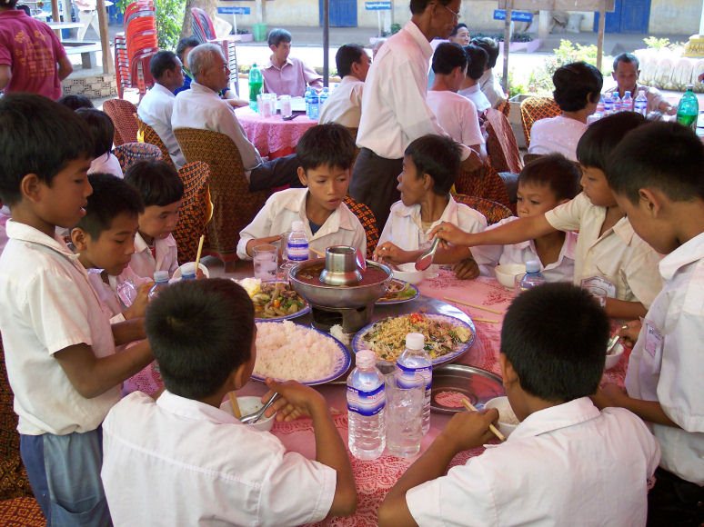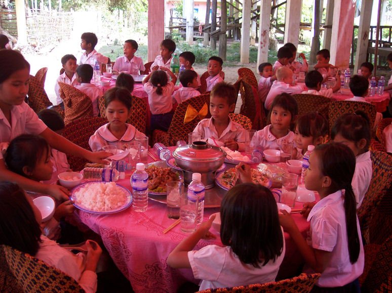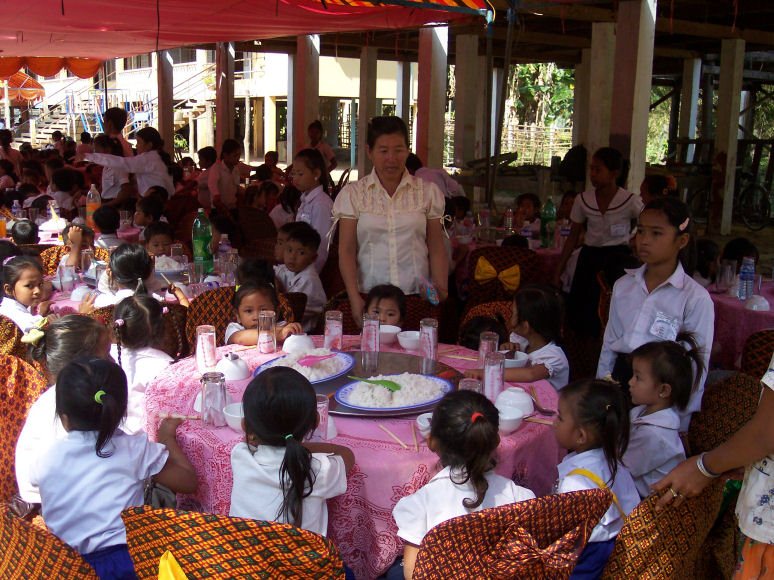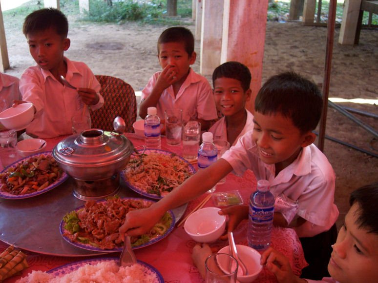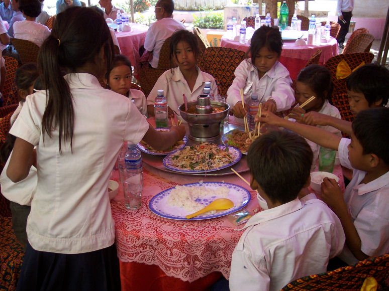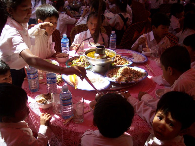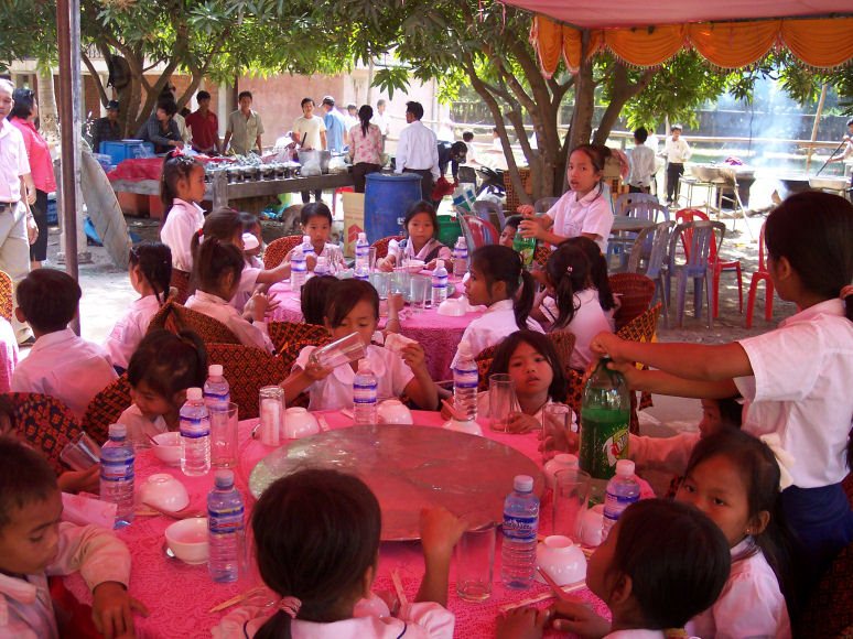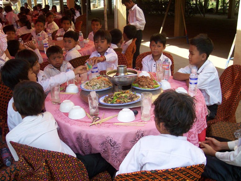 Repas1 sauté de bœuf, 1 salade vermicelles, 1 soupe acide échine de porc, 1 sauté de porc aux légumes variés, du riz à volonté, 1 bouteille de 2 litres de soda, 10 bouteilles de 50 cl d'eau minérale et 10 barquettes de dessert (multiples Gâteaux Khmers)