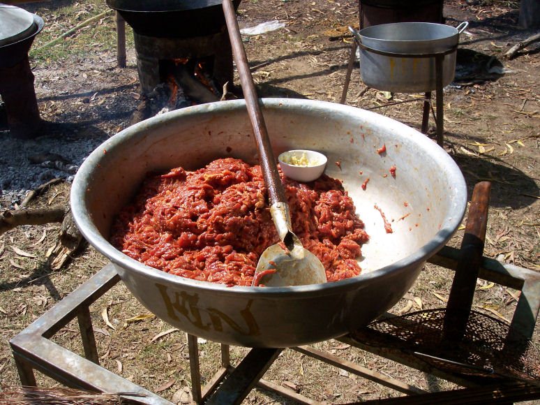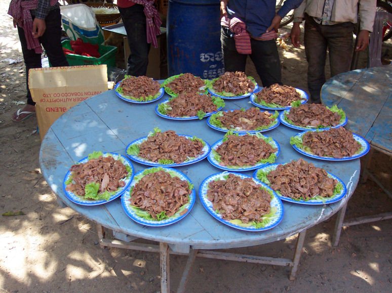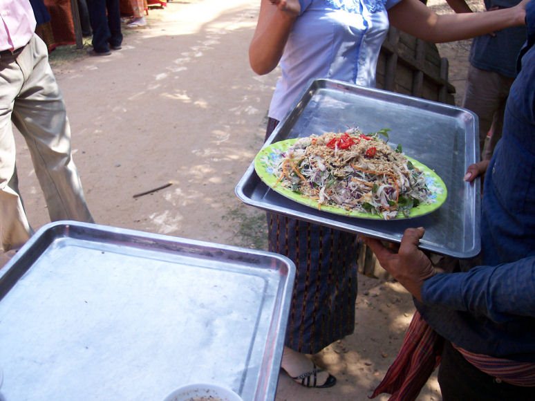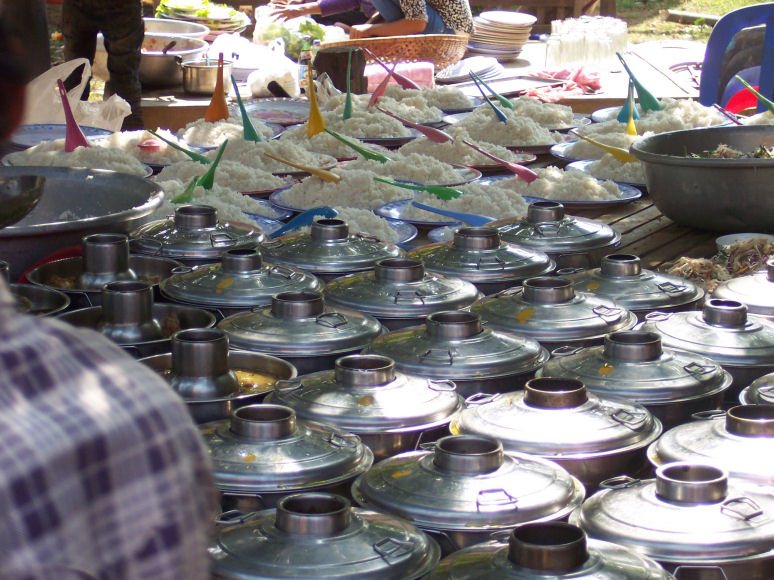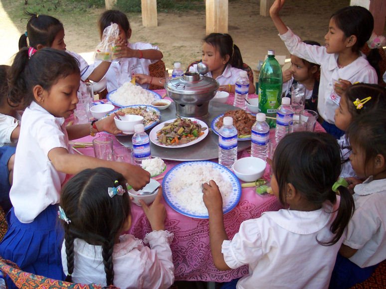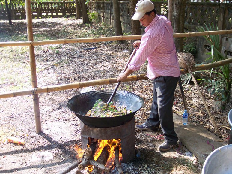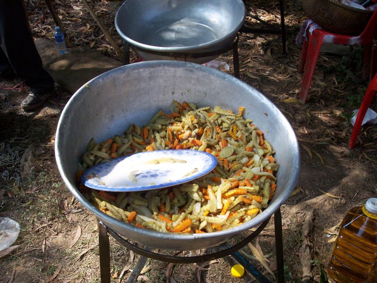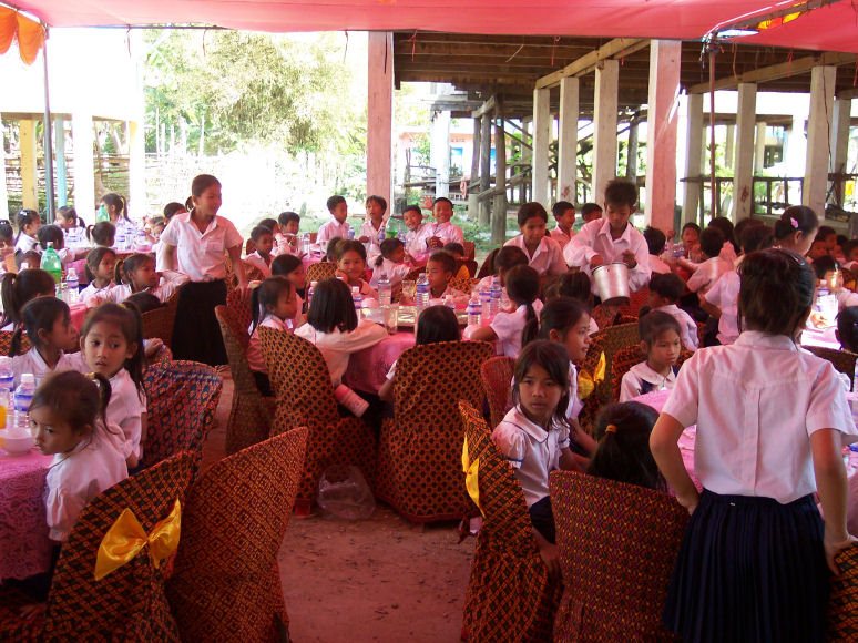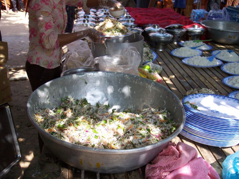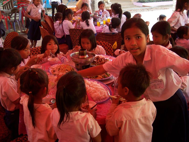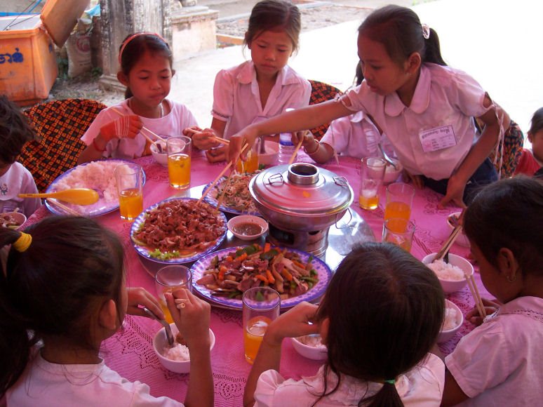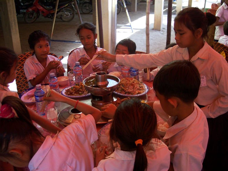 Repas1 sauté de bœuf, 1 salade vermicelles, 1 soupe acide échine de porc, 1 sauté de porc aux légumes variés, du riz à volonté, 1 bouteille de 2 litres de soda, 10 bouteilles de 50 cl d'eau minérale et 10 barquettes de dessert (multiples Gâteaux Khmers)