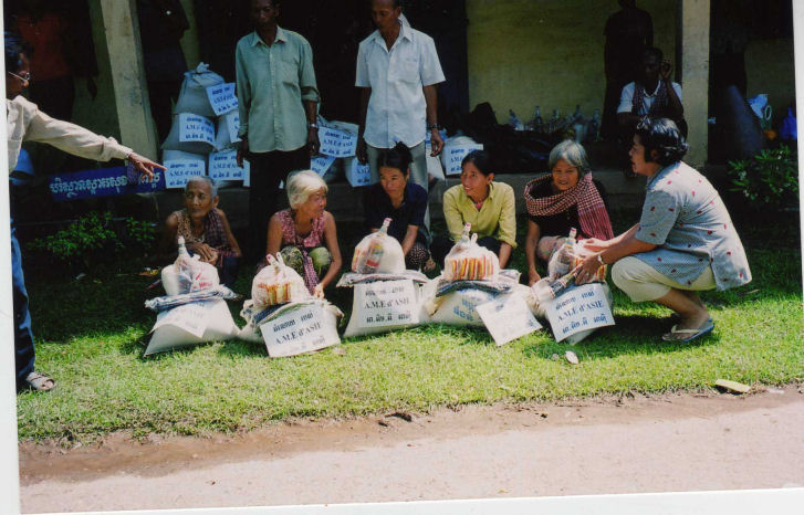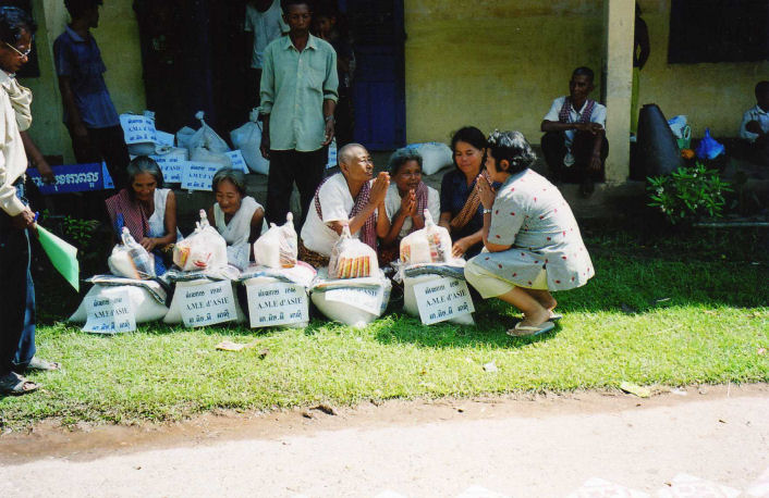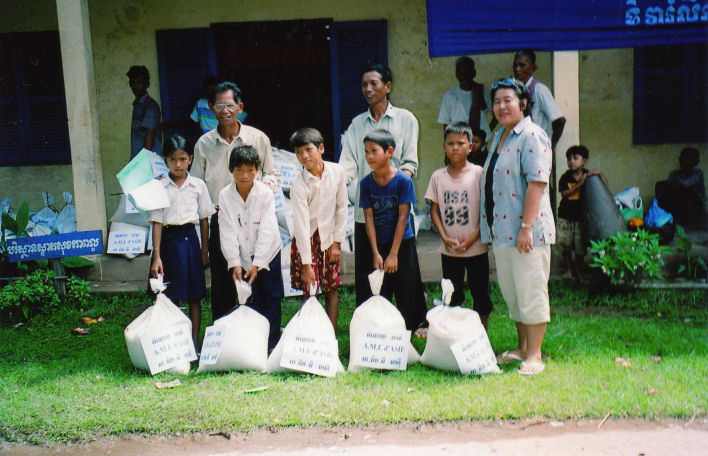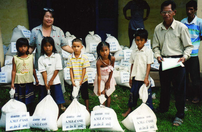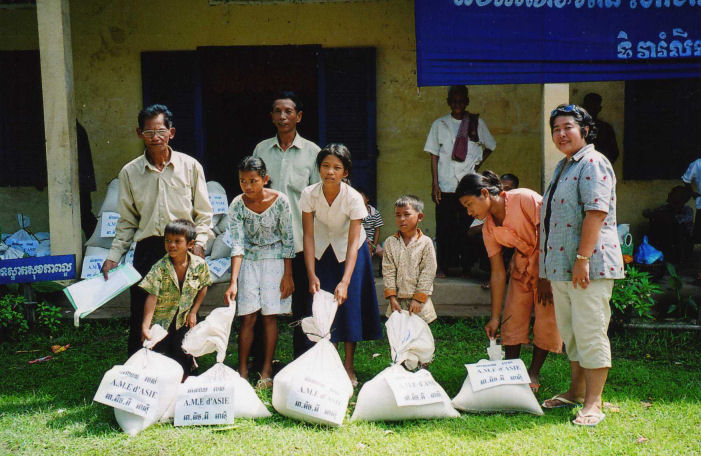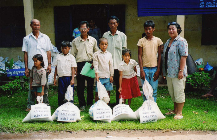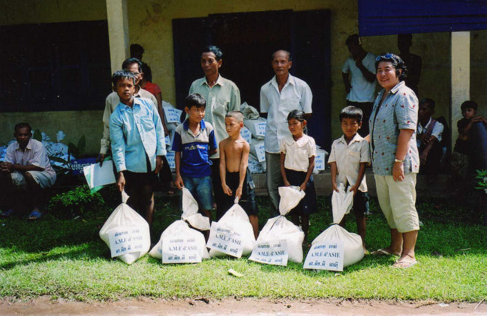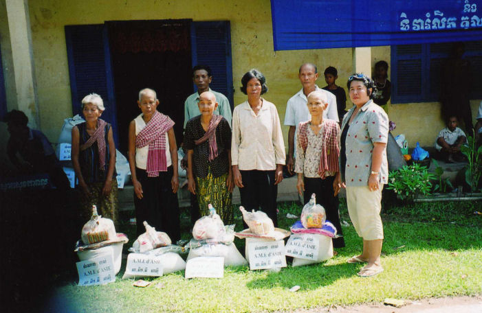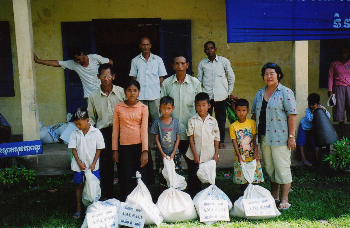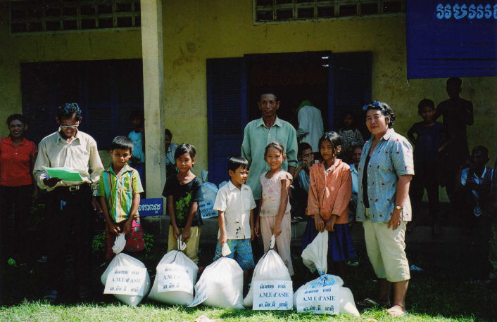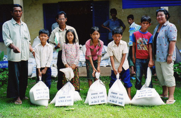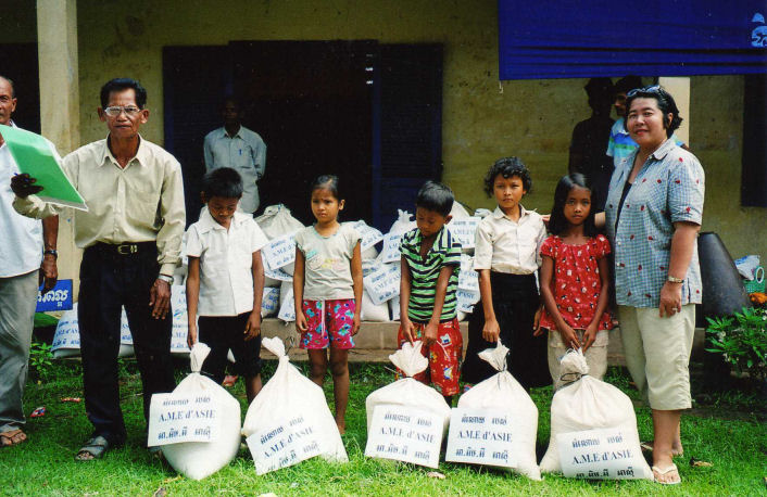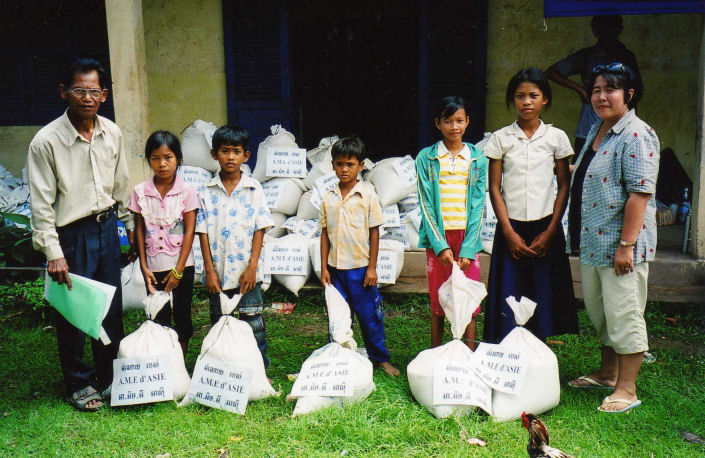La maîtresse d’école derrière les enfants, le directeur de l’école, les Chefs de Village, les 5 des personnes âgées dont la dame en chemise noire âgée de 94 ans et les enfants accompagné de Madame Chantévi Chuon notre permanente à Phnom Penh, pose sur les photos avec les sacs de riz de l’association, au dessus les sacs contenant les différent produits offerts par Chantévi