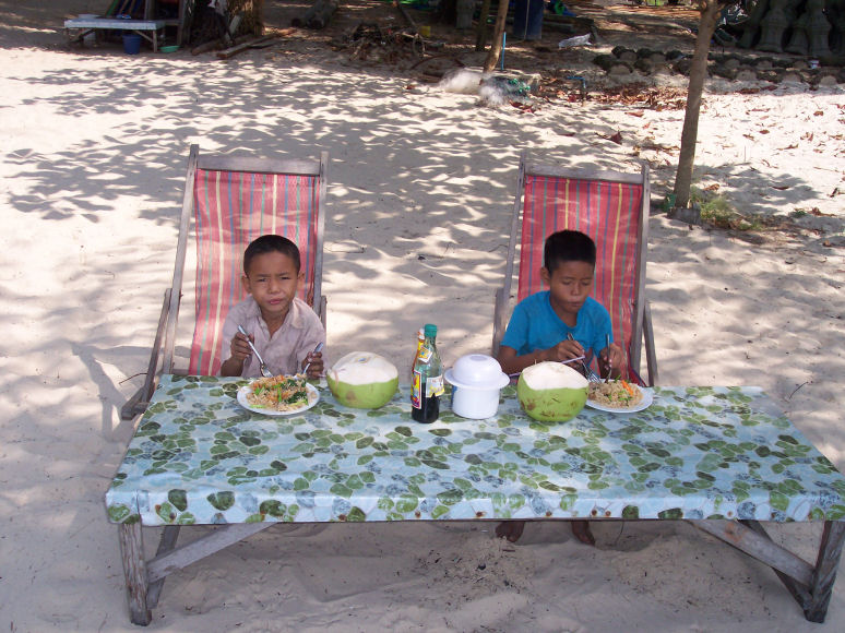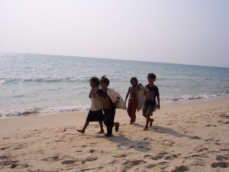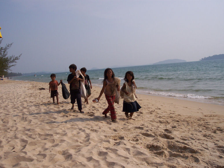 Le long des plages de Sihanoukville, sous l’œil indifférent des touristes, des groupes d’enfants scrutent sans relâche, sous un soleil de plomb, les tables couvertes d’une nourriture à laquelle ils n’ont jamais droit. Ils recherchent des canettes d’aluminium ou des bouteilles en plastique. Ce maigre butin sera revendu et leur permettra de récolter entre 50 et 80 centimes d’euros par jour, juste de quoi se nourrir. Ils vivent ainsi au jour le jour. A ces enfants, nous leurs avons offert une journée de repos au bord de la mer. Nous les avons installés sur des chaises longues, avec un vrai repas.
