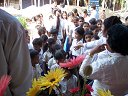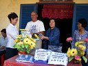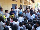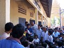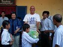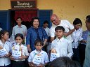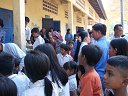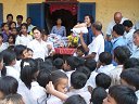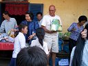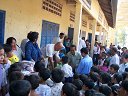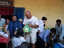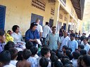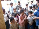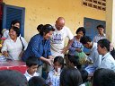 Ce village n’a jamais reçu aucune aide de quelque nature que ce soit. il est à 4 heures de route de Phnom Penh puis 2 heures de bateau en remontant le Mékong et 1 heure de marche. Ce village au bout du monde, perdu dans la campagne, sans aucune route pour y accéder, sans eau ni électricité, est inondé chaque année et les terres cultivables s’y réduisent comme peau de chagrin. Ces enfants ne mangent qu’un jour sur deux et cherchent leurs protéines dans les puces d’eau et autres insectes. Dans ce village le directeur de l’école ne gagne que 30 Euros par mois et n’est payé que tous les 2 mois. Chaque jour, des enfants parcourent 2 heures de marche pieds nus à travers les champs pour venir à l’école, leurs pieds sont si meurtris qu’en arrivant, ils les posent sur leur cahier pour les soulager. 260 enfants dont 56 orphelins y vivent au jour le jour sans aucun espoir d’une vie meilleure. Il n’y a plus aucune jeune fille à Kampong Kra bey, une étrangère est venue les chercher pour les marier à des étrangers, elle a assuré aux parents le bonheur de leurs filles mais depuis plus de nouvelle. C’est dans ce village que nous avons décidé de remplir l’essentiel de notre mission 2007 au Cambodge. Nous avons distribué à chaque écolier, de quoi se vêtir, 15kg de riz, 2 kg de nouilles, 1 litre de sauce de soja, 1 litre de sauce de poisson, 1kg de sucre en poudre, une paire de tongs, des cahiers, des stylos et des crayons de couleur. Nous avons également distribué une chemise et un Krama à chaque enseignant. La distribution s’est faite le jour de l’anniversaire de la naissance de Bouddha, toute une symbolique pour ces enfants qui pour la première fois de leur vie recevaient une aide extérieure.